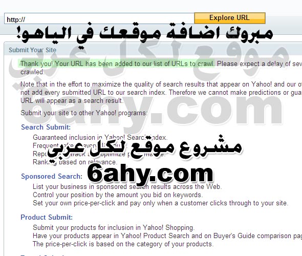 مبروك اضافة موقعك في الياهو !!طبعا الصبر مطلوب ... يعني لا تذهب مباشرة بعد ذلك وتبحث عن موقعك ولكن انتظر بضعة ايام ثم جرب وهكذا...